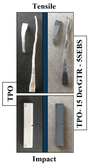 On the other hand, the incorporation of the compatibilizing agent enabled to a certain degree the enhancement of the material mechanical properties. A greater impact was noticed on the elongation at break that increased from 370% to 545% for the 3D-printed TPO-15 GTR-5 SEBS and from 400% to 550% for 3D-printed TPO-15 DevGTR-5 SEBS, indicating the improved adhesion between the phases. The general profile of the stress–strain curves remained like the pristine TPO (Figure 8), as well as the elongation and deformation upon traction of the specimens during both tensile and impact tests (Figure 9). The incorporation of SEBS within TPO containing 15 wt.% GTR did not induce any enhancement of elongation at break for compressed molded materials, while the positive effect of SEBS is clearly demonstrated for 3D printed materials.
