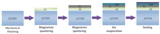 The layers were obtained using a four-stage hybrid method [,]. A schematic presentation of the experimental procedure, including uncoated and coated sample processing, is shown in Figure 1.