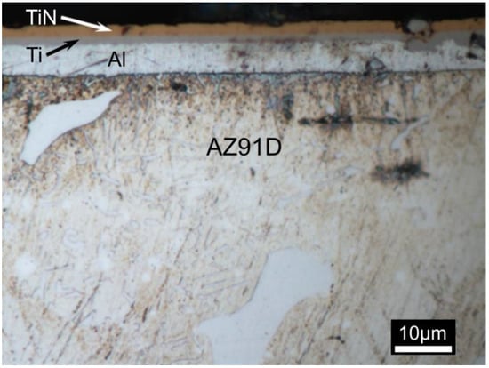 The microstructure of the composite surface titanium nitride TiN–Ti–Al type layers with a sub-layer of titanium and aluminum (TiN2Ti1Al10), produced on AZ91D magnesium alloy using the hybrid method, combining magnetron sputtering of intermediate layers and cathode arc evaporation of the outside titanium nitride layer, is shown in Figure 2.