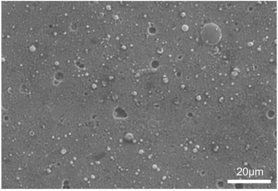 The thickness of the component layers starting from the surface was successively: surface titanium nitride layer (gold)—circa 2 µm; titanium sub-layer (grey)—circa 1 µm and aluminum (white)—circa 7 µm (Figure 2). Some defects in varying depth in the form of holes are visible in the surface titanium nitride layer. Neither of the sub-layers exhibited any visible discontinuities. These layers, which diffusively bound with the magnesium alloy, as shown by our earlier research [], demonstrated good adhesion to the substrate and the absence of macroscopic defects or cross-layer discontinuities. The layers exhibited a surface morphology that is typical for the arc evaporation method used for the deposition of the outer titanium nitride, with characteristic defects, such as the so-called droplets and craters left after droplet decohesion (Figure 3), with craters being relatively shallow (Figure 2) and limited to the outside titanium nitride layer [].