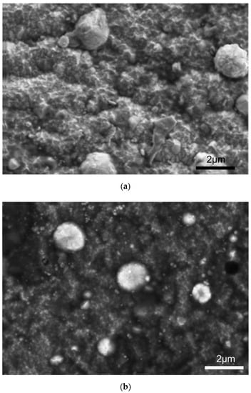 Surface morphology of the outside titanium nitride layer of the composite TiN2Ti1Al10 layer with modification produced by pressure hydrothermal treatment in overheated steam process: (a) before the process—as deposited (TiN2Ti1Al10) and (b) after the process (TiN2Ti1Al10_SS).