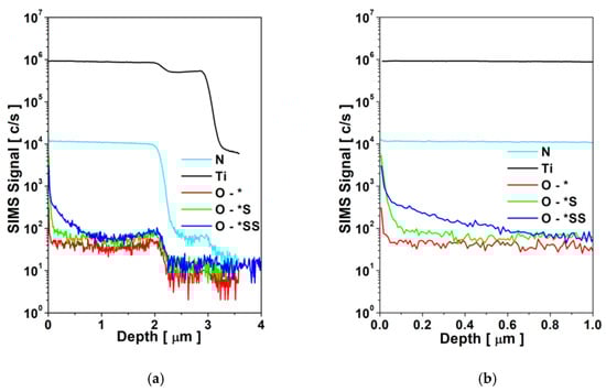 The distribution of the elements in the TiN-Ti near-surface zone of the composite TiN2Ti1Al10-type titanium nitride layers, determined using secondary ion mass spectrometry (SIMS), is shown in Figure 5. The analysis demonstrates that the sealing hydrothermal treatment of the layers for both variants (TiN2Ti1Al10_S and TiN2Ti1Al10_SS) results in an increased oxygen concentration at the layer’s surface and in its vicinity. The oxygen penetration in the depth of the layer is clearly visible in the case of processing in the overheated steam (TiN2Ti1Al10_SS), while for processing in boiling water (TiN2Ti1Al10_S), the oxygen concentrates at the surface with only slightly pronounced penetration into the layer-surface vicinity. However, the increased concentration of oxygen persists for both sealing variants across the TiN titanium nitride surface layer and the titanium sub-layer, higher in the case of the TiN2Ti1Al10_SS variant.