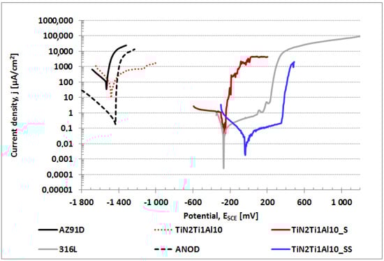 Polarization curves for uncoated (AZ91D) and anodized (ANOD) magnesium AZ91D alloy and for the alloy with various variants of composite TiN-Ti-Al titanium nitride layer: as-deposited (TiN2Ti1Al10) and sealed using hydrothermal treatment: in boiling water bath (TiN2Ti1Al10_S); in overheated steam (TiN2Ti1Al10_SS). For comparison, 316L stainless steel.