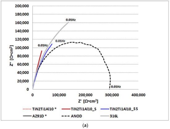 Impedance spectroscopy results obtained for the AZ91D alloy covered with various composite TiN-Ti-Al titanium nitride surface layers in the as-deposited (TiN2Ti1Al10) and sealed (TiN2Ti1Al10_S TiN2Ti1Al10_SS) variants and, for comparison, the untreated (AZ91D), anodized AZ91D alloy (ANOD) and 316L stainless steel (316L) Nyquist plots: (a) general view; (b) magnification for low impedance variants curves, not visible in Figure 7a: TiN2Ti1Al10* and AZ91D*.