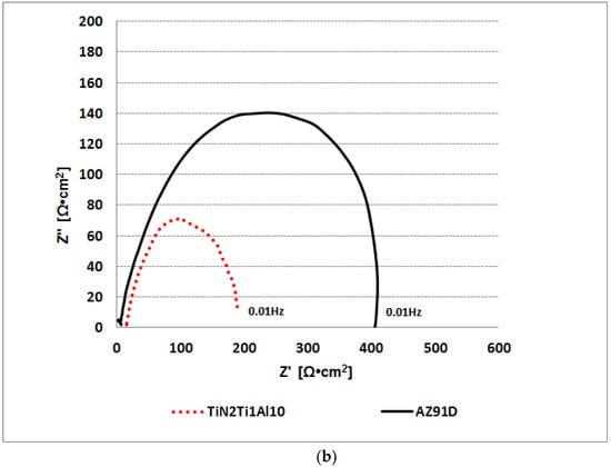 Hydrothermal treatment in overheated steam results in an unusually large (for magnesium alloys) shift in the corrosion potential to the value of circa Ecor = −40 mV, i.e., by almost ΔEcor = 1500 mV, relative to unprotected AZ91D alloy with a titanium nitride layer (AZ91D) with Ecor = −1530 mV. The resulting increase of corrosion potential is circa ΔEcor = 220 mV higher than in the case of hydrothermal treatment in boiling water bath and is associated with the corrosion current decrease by an order of magnitude at circa icor = 0.022 µA/cm2. This demonstrates a more efficient tightening of the layer in the overheated steam process. The main benefits from processing in overheated steam is the resulting relatively broad (ca. 300 mV large) passive range with a positive breakdown potential of circa Enp = 350 mV, resulting in corrosion resistance that is much better than that of the commercially anodized AZ91D alloy (ANOD) (Figure 6), which despite of the relatively low value of corrosion potential Ecor = −1445 mV does not exhibit any passive behavior. Moreover, what may be considered as the most significant achievement of the new solution, the corrosion resistance of the composite TiN-Ti-Al titanium nitride surface layers on the AZ91D alloy treated in overheated steam is better than that of 316L stainless steel (Figure 6). The polarization test results are consistent with the results of impedance spectroscopy tests (Figure 7), showing high impedance values for Z′, Z″, comparable to those of stainless steel, and higher than those of commercially anodized alloy; thus, confirming the achieved high corrosion resistance.