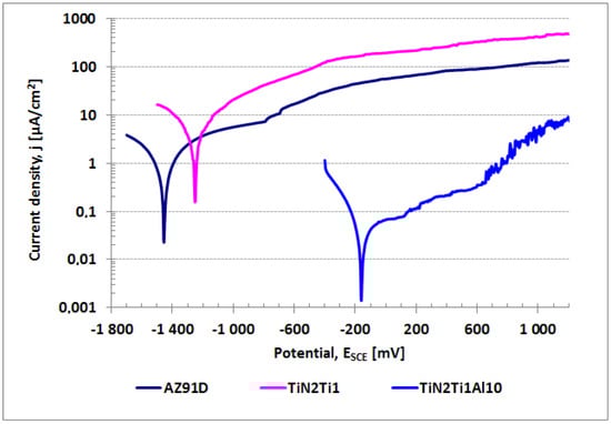 Polarization curves in deionized water for magnesium AZ91D alloy uncoated (AZ91) and coated with various types of titanium nitride surface layers: TiN-Ti-Al type with a titanium and aluminum sub-layer and, TiN-Ti type with titanium and without aluminum sub-layer, both in as-deposited variants (TiN2Ti1Al10 and TiN2Ti1_S, respectively).