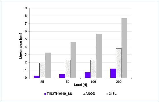 A complex characterization of the mechanical performance properties of the composite TiN-Ti-Al type titanium nitride layers was performed during our previous work [] and demonstrated that the layers, not only significantly improved corrosion resistance, but also mechanical damage resistance to factors such as exposure to concentrated point loads, scratching, or wear. None of these exposures resulted in cracks or layer decohesion. In fact, the layer’s resistance to mechanical continuity failure is a key advantage of the developed composite titanium nitride layers given the critical requirement of absolute tightness of the layers, as noted previously [,], related with their cathodic nature and the highly active magnesium substrate, thus highly susceptible to galvanic corrosion. However, it is worth noting that, for the reasons discussed above, in the case of the composite TiN-Ti-Al type titanium nitride layers subjected to the hydrothermal treatment in the overheated steam (TiN2Ti1Al10_SS), which are sealed deep inside the titanium sub-layer, even if the continuity of either the tightening film on the layer’s surface or the outer nitride zone fails mechanically, it would not be critical from the corrosion resistance point of view. The mechanical resistance of the composite TiN-Ti-Al type titanium nitride layers in wear condition is much higher than commercially anodized AZ91D alloy; in fact, it is comparable to the resistance of typical bearing 100Cr6 steel []. Moreover, the wear resistance examinations of the composite TiN-Ti-Al titanium nitride layer hydrothermally pressure processed in overheated steam (TiN2Ti1Al10_SS) and the reference materials (Table 1) investigated during the present work (Figure 9) showed that the coated AZ91D magnesium alloy exhibits wear resistance much higher than the reference stainless 316L steel.