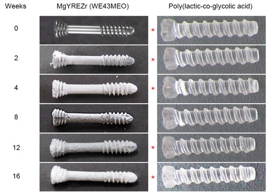 The tests included 84 screws of 14 mm length made for osteosynthesis of the mandible head by ChM (www.chm.eu; Juchnowiec Koscielny, Poland): 2.2 mm diameter magnesium alloy MgYREZr, i.e., WE43 MEO 42 screws and 2.5 mm diameter poly(lactic-coglycolic) acid in a molar ratio of 85:15 (42 pieces). Polylactic-coglycolic acid (PLGA), which is considered a good alternative to titanium in osteosynthesis, was chosen as the control [,,,,,,].