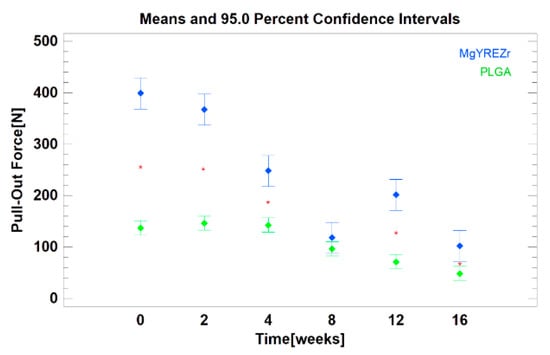 Statistical analysis was performed in Statgraphics Centurion 18 (Statgraphics Technologies Inc., The Plains, VA, USA). A T-test was applied to compare the means (normally distributed variables), and a Mann–Whitney W-test was used to compare the medians (non-normally distributed variables) of the two independent samples for axial pull-out force comparison at the same time moment between MgYREZr versus PLGA screws. The same tests were used to assess the decrease in pull-out force with the duration of resorption.