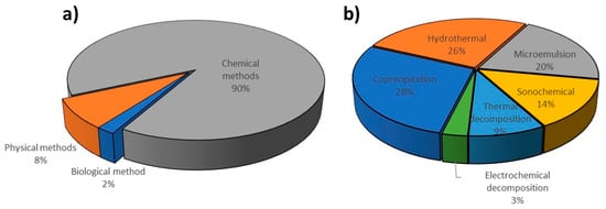 Synthetic methods for magnetic nanoparticles preparation can be classified according to the type of process that results in obtaining magnetic nanomaterial. Currently, the following synthesis approaches can be distinguished: chemical, physical, and biological. All of the listed methods have their advantages and disadvantages. Biological methods involving the use of microorganisms for the synthesis of nanoparticles allow for precise control of the obtained material. They are characterized by high process efficiency and very high repeatability. Moreover, they are inexpensive, but the fermentation process is quite time-consuming. Although physical methods for obtaining MNPs are easy to perform, it is difficult to control the size of the resulting nanoparticles in contrast to chemical methods covering about 90% of all techniques (Figure 1) [19].