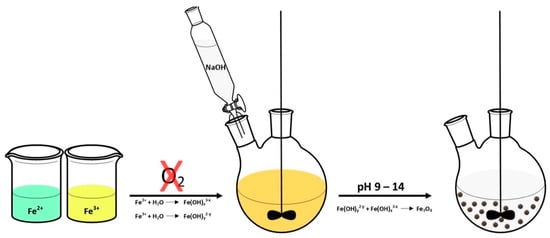 The co-precipitation reaction is the most popular method of magnetic nanomaterials synthesis. This route is widely used for the preparation of magnetite nanomaterials intended for biomedical applications due to non-toxic reagents. Co-precipitation is about reaction of magnetite formation in alkaline solution. It is necessary to keep anaerobic reaction conditions to prevent the conversion of magnetite to iron (III) oxide and then iron (III) hydroxide. Such conversion is very unfavorable for biomedical applications due to the ability of iron (III) oxide to form free radicals and the insolubility of iron (III) hydroxide. To avoid the oxidation of magnetite during the synthesis of nanoparticles, various types of stabilizers are introduced to protect the magnetite against oxygen. Moreover, magnetic phase and particle size can be controlled by changing the Fe2+/Fe3+ ions ratio, temperature, pH, and the type of used base solution [39,40]. The scheme of the magnetite synthesis from alkaline solutions of iron (II) and (III) salts is presented in Figure 2.