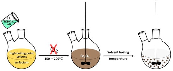 Thermal decomposition is based on the decomposition of metal precursors (e.g., acetylacetonates, carbonyls, or oleates) at high temperatures (150–300 °C) in the presence of organic solvents characterized with high boiling point (250–300 °C) such as octadecene or benzyl ether [41]. The presence of dispersants and hydrophobic ligands, including oleic acid, lauric acid, oleylamine, and hexadecyl amine, is required to control the size and shape of formed nanoparticles and prevent their aggregation [42,43]. This synthesis procedure is divided into three main steps. Firstly, a mixture of solvent with organometallic precursors, surfactants, and stabilizing agents is heated at a constant rate to reach the nucleation or decomposition temperature of the precursor. Next, the solution is heated to the boiling point of the solvent, which leads to the formation of small nanocrystals, and the final step consists of growth phase in which the solution is refluxed for some time and cooled to room temperature [44]. The schematic representation of this type of synthesis is presented in Figure 3.