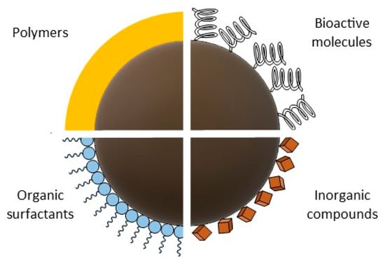 Bare magnetite nanoparticles without surface modification with low- or high-molecular compounds have a limited applications as a result of the spontaneous aggregates formation [65]. In addition, uncoated MNPs are characterized by many unfavorable properties, such as chemical instability, poor biodegradability in the physiological environment, and non-specific interaction with blood serum proteins [66]. Moreover, the lack of a stabilizing coating for the magnetic core makes magnetite susceptible to oxidation with oxygen in the air, which as already mentioned is particularly negative for biomedical applications. The cover layer also reduce the risk of adverse effects of material when nanoparticles are used as therapeutic agent [67,68] and allows for the improvement of nanoparticle dispersion in solutions, limiting their toxicity, as well as improving the physicochemical and functional properties. The shell covering the magnetic core can be generated in situ during the preparation of the nanoparticles themselves, or then, the previously obtained pure nanoparticles can be coated. Organic surfactants and inorganic compounds, bioactive compounds, as well as natural and synthetic polymers are used for surface of nanoparticles coating (Figure 5) [69].