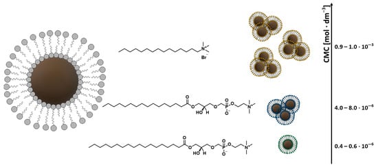 Surfactants such as oleic acid, lauric acid, alkylsulfonic, and alkylphosphonic acids are used for magnetic nanoparticles stabilization [20]. Sahoo et al. proved based on photos from an electron microscope that carboxylate surfactants provide particles with better isolation and dispersibility than phosphonate surfactants [70]. Unfortunately, long hydrocarbon chains from the surfactant structure cause the nanoparticles to be highly hydrophobic, which makes their use in vivo much more difficult [71]. The research of Luchini and co-authors was aimed at overcoming these limitations. They showed that the use of surfactants with low critical micelle concentration (CMC) values for the functionalization of MNPs resulted in their greater dispersion in solutions, and additionally, the coating process of nanoparticles was more efficient than with surfactants with higher CMC values (Figure 6) [72].