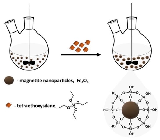Coating the magnetite core with inorganic compounds, apart from ensuring the stability of nanoparticles, quite significantly broadens the area of their application [73]. The most commonly used compounds for this purpose are silicon compounds, metals and their oxides, sulfides, carbon in the form of graphene and its oxide, and nanotubes [74,75,76]. Silica is a classic coating material for nanoparticles, as it can enhance their dispersion in aqueous solutions, endows them greater durability, and protects them in acidic environments [69,77,78]. The coating of nanoparticles with silica (SiO2) was carried out based on a modified Stöber process [79]. This method uses tetraethoxysilane (TEOS) as a silicon shell precursor in the hydrolysis and condensation reaction (Figure 7). The synthesis is carried out in an aqueous ethanol solution in the presence of ammonia as a homogeneous catalyst [79]. The presence of silanol groups on the surface of magnetic nanoparticles reduces their potential toxicity and also causes the colloidal stability of nanoparticles in the physiological pH range. Thanks to that, MNPs can be successfully used in molecular biology and medicine [80,81,82].
