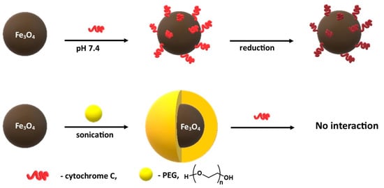 On the basis of Mukhopadhyay’s [124] research, it can be concluded that PEG coatings are effective means of protecting biomolecules against the toxicity generated by magnetite nanoparticles. Mukhopadhyay [124] et al. described the interaction of magnetic nanoparticles coated with ethylene glycol and Cytochrome C, which acts as an electron transporter in the respiratory chain. The interaction of naked uncoated nanoparticles with Cytochrome C led to the reduction of this protein, while the magnetite nanoparticles coated with PEG showed no affinity for Cytochrome C and finally did not reduce it (Figure 8).
