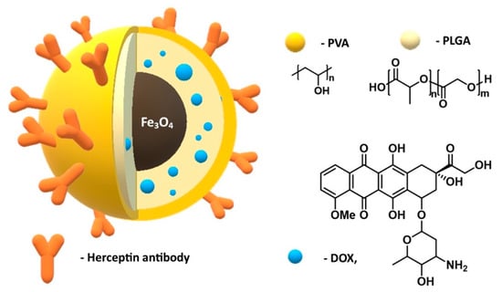 Jaemoon Yang and co-authors synthesized a multimodal nanocomposite using inorganic and organic materials for cancer detection and treatment [143]. The nanoemulsion method was used to incorporate doxorubicin, an anti-cancer drug (DOX), into magnetic nanoparticles coated with a mixture of poly (D,L-lactide-co-glycolide) and PVA (Figure 9) [144]. The Herceptin (HER) antibody used in the treatment of breast cancer was also immobilized on the surface of these nanoparticles (with EDC/NHS as a linker) without loss of its affinity for cancer cells. Additionally, the drug enclosed in the polymer shell was released in a balanced manner without any inhibition. These multi-functional composites may have applications in targeted drug delivery, MRI probes, and also cell separation.
