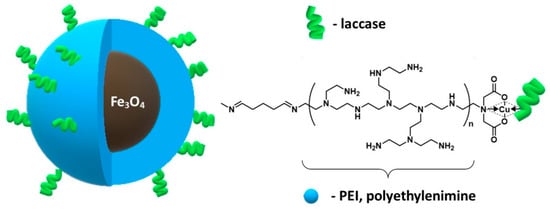 In 2016, Xia and co-authors described the synthesis of polyethyleneimine-coated nanoparticles (Fe3O4–NH2–PEI MNPs) [149]. Afterwards, this nanomaterial was chelated with copper ions in order to immobilize the Trametes versicolor laccase by physical immobilization—adsorption (Figure 11). Laccase as a multi-copper oxidase (belongs to the group of polyphenol oxidases) can be produced by numerous plants, funguses, and bacteria [150,151]. As a result of its relatively low substrate specificity and high catalytic activity, it has gained extensive attention in various fields such as environmental remediation, the pulp and paper industry, and biosensing [152]. However, the industrial applications of this enzyme are limited due to the low stability and poor reusability of free laccase [150,153]. The results obtained for the enzyme immobilized on (Fe3O4–NH2–PEI MNPs) nanoparticles were compared with those obtained for the enzyme immobilized on the particles without a polymer coating (Fe3O4–NH2 MNPs) containing only amino groups. It was noticed that polymer-modified nanoparticles show a higher adsorption capacity compared to nanoparticles without the polymer coating. Additionally, the recovery of laccase activity for nanoparticles with polyethyleneimine was two times higher than for magnetite nanoparticles without polymer. In addition, the activity of the immobilized enzyme improved significantly; the specific laccase activity was 101.33 times higher than for free enzyme. Moreover, immobilization allowed the enzyme to be reused. Immobilized enzymes on PEI-coated nanoparticles preserved 44.89% of their original activity after the 5th reuse. The activity loss in these steps may be related to particle agglomeration and the inactivation of laccase upon use.