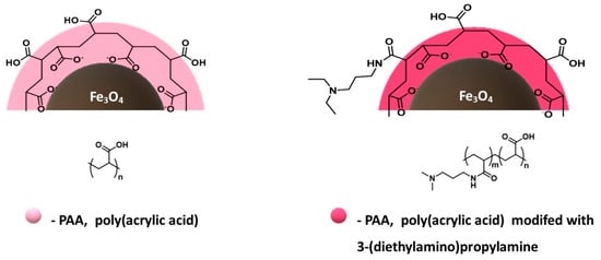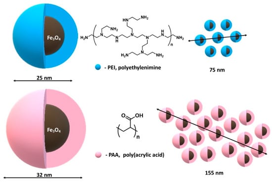 The biomedical applications of magnetite nanoparticles are primarily cancer diagnostics and therapies (Magnetic Resonance Imaging, Hyperthermia, Magnetic Field-Assisted Radiotherapy, Photodynamic Therapy), biocatalysis, pharmaceutical analysis, tissue engineering, biosensor, and the immobilization of biomolecules such as proteins [3,12,13,14,15]. However, pure, uncoated magnetite nanoparticles have some limitations in use by reason of the ability to spontaneously form aggregates (a result of the system’s desire to reduce surface energy, both under the influence of the magnetic field and the biological environment) [16]. Moreover, non-functionalized Fe3O4 nanoparticles are characterized by high chemical activity and susceptibility to oxidation, which often leads to a decrease or complete loss of magnetic properties. Covering the magnetite core with a coating, which may be inorganic and organic compounds, surfactants and polymers lead to the stabilization of the nanomagnetic material and, as a result, to the possibility of its wider use, e.g., in industry [17,18,19].