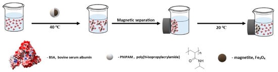 - Shamim, N.; Hong, L.; Hidajat, K.; Uddin, M.S. Thermosensitive-polymer-coated magnetic nanoparticles: Adsorption and desorption of Bovine Serum Albumin. J. Colloid Interface Sci. 2006, 304, 1–8. [Google Scholar] [CrossRef]