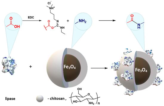 - Wang, X.Y.; Jiang, X.P.; Li, Y.; Zeng, S.; Zhang, Y.W. Preparation Fe3O4@chitosan magnetic particles for covalent immobilization of lipase from Thermomyces lanuginosus. Int. J. Biol. Macromol. 2015, 75, 44–50. [Google Scholar] [CrossRef]