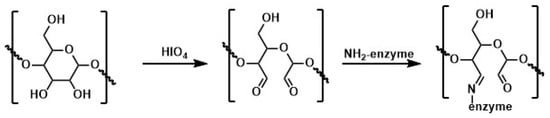 Covalent immobilization is a chemical method of protein binding on the carrier surface. It involves the formation of a covalent bond between the functional groups of the protein and support. It is advisable to use such protein functional groups in the immobilization process, which are susceptible to chemical modification and do not participate in the stabilization of the third and fourth-order structure of the protein [104]. The cysteine thiol group, phenyl ring of tyrosine, imidazole group of histidine, and amino group of lysine are most often used for this purpose. In order to easily react the above-mentioned functional groups of the protein, the surface of the support should contain reactive amino, hydroxyl, carboxyl, vinyl sulfone, vinyl ketone, oxirane, aldehyde, halide, and thiol groups. Depending on the type and presence of functional groups on the carrier surface, the formation of the carrier–protein covalent bond consists in the following reactions: arylation, amidation, diazotization, alkylation, and the formation of Schiff bases or amide bonds. Coupling agents such as glutaraldehyde (GA) [112], glyoxal [4], epichlorohydrin [104], 1-ethyl-3-(3-dimethyl-aminopropyl) carbodiimide (EDC), and N-hydroxysuccinimide (NHS) [113] are often used in protein covalent immobilization [114]. For example, EDC activates carboxyl groups of protein and forms an amine reactive O-acylisourea intermediate that spontaneously reacts with primary amines to form an amide bond and an isourea by-product. The O-acylisourea intermediate is unstable in aqueous solutions, and failure to react with an amine will cause hydrolysis of the intermediate, regeneration of the carboxyls, and the release of an N-substituted urea [115,116]. Therefore, it is necessary to quench the EDC activation reaction with a thiol-containing compound such as 2-mercaptoethanol. EDC couples NHS to carboxyls, which forms an NHS ester that is considerably more stable than the O-acylisourea intermediate and allows for efficient conjugation to primary amines at physiological pH. The advantageous quality of EDC is that it is water soluble and dissolves in aqueous buffer solutions, similar to most biological macromolecules [117]