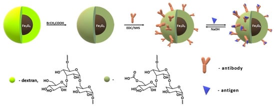 As already mentioned, the surface of the magnetite core can be coated with various compounds, of which polymers seem to be the most attractive [12]. Deposition of the polymer on the surface of magnetite nanoparticles provides its chemical and thermal stability [16,28,29]. In addition, in the case of nanoparticles coated with polymers, a smaller tendency to their aggregation is observed, which significantly increases their usability [30,31]. Furthermore, most polymers, and in particular biopolymers, have in their structure reactive amino, carboxyl, and hydroxyl groups, which can be successfully used in the immobilization of proteins [30]. Therefore, in recent years, there has been a growing interest in the synthesis of magnetite nanoparticles coated with macromolecules and their subsequent application for the immobilization of bioligands [32,33,34].