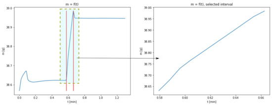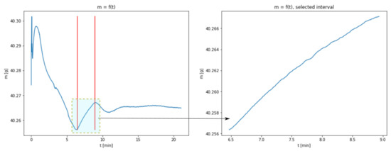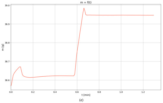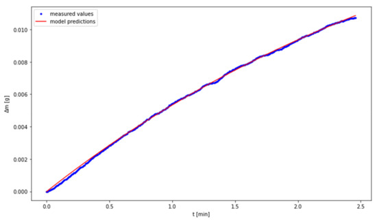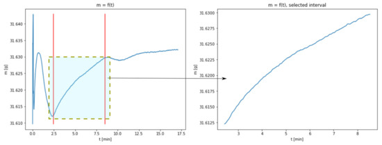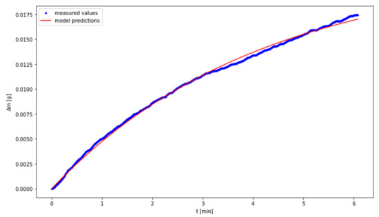 The lack of a distinctive growth phase of the mass may be connected with a considerable acceleration of the carbonation process resulting from increased temperature. The complete transformation of CaO into CaCO3 takes place at the same time as the process of water evaporation; in the chart, a cumulative effect of both the phenomena is observed. A section related to the growth of sample mass was isolated from the charts representing temperatures of 40, 60 and 80 °C. The borders of the isolated areas were selected in such a way so as not to include the transient phases, i.e., the gradual flattening of the curve approaching the peak. Figure 2, Figure 3 and Figure 4 show the obtained charts.