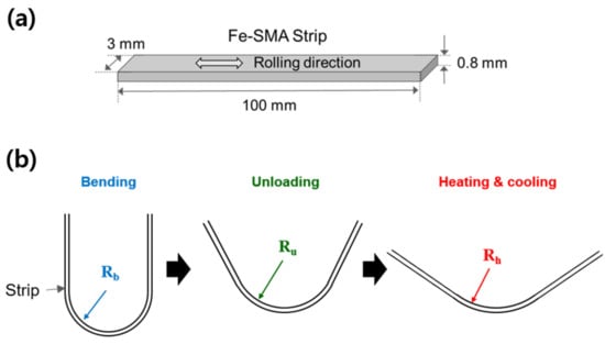 The Fe-SMA used in this study consisted of the chemical composition listed in Table 1. The Fe-SMA samples were fabricated by first producing a 50 Kg ingot using a vacuum-induction melting device (Hankook Vacuum Metallurgy Co., Ltd., Ansan, Republic of Korea). The ingot underwent homogenization and heat-treatment at 1250 °C for 6 h. After the homogenization treatment, the alloy ingot was forged and stepwisely hot-rolled at 1000 °C until the alloy’s thickness reached 5 mm. Finally, the hot-rolled alloy was cold-rolled at room temperature (RT, ~25 °C) in a single pass via a 10% reduction in thickness, i.e., to a thickness of 4.5 mm. The thickness reduction of 10% was selected based on preliminary tests where cold-rolling of this alloy caused a thickness reduction of more than 10%, resulting in cracks.