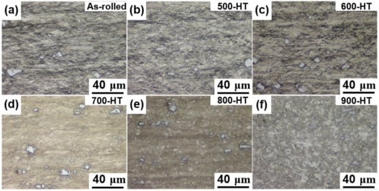 Optical microscope (OM) images (×500) of Fe-Mn-Si-based shape memory alloys (Fe-SMA) in different heat-treatment conditions. Rolling direction is horizontal to the images; (a) as-rolled, (b) 500 °C heat-treated, (c) 600 °C heat-treated, (d) 700 °C heat-treated, (e) 800 °C heat-treated, and (f) 900 °C heat-treated.
