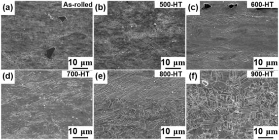Scanning electron microscope (SEM) images (×2000) of Fe-SMA in different heat-treatment conditions. Rolling direction is horizontal to the images; (a) as-rolled, (b) 500 °C heat-treated, (c) 600 °C heat-treated, (d) 700 °C heat-treated, (e) 800 °C heat-treated, and (f) 900 °C heat-treated.