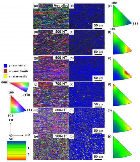 (a,d,g,j,m,p) Electron backscatter diffraction (EBSD) rolling direction (RD) inverse pole figure maps, (b,e,h,k,n,q) phase maps, and (c,f,i,o,r) RD pole figures; (a–c) as-rolled, (d–f) 500 °C heat-treated, (g–i) 600 °C heat-treated, (j–l) 700 °C heat-treated, (m–o) 800 °C heat-treated, and (p–r) 900 °C heat-treated.