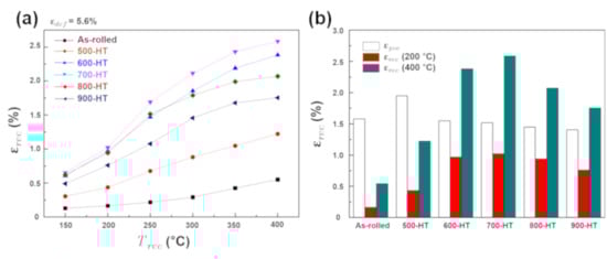 Considering the application of this alloy as a prestressing reinforcement of concrete structures, cold-rolling and annealing at 500 or 600 °C seem to be effective in obtaining significant recovery stress. As shown in Figure 6b, the recovery strain of the 500-HT and 600-HT samples were approximately 0.5 and 1%, respectively, for Trec = 200 °C. These recovery strains are comparably small but significant enough to produce large recovery stress []. As the yield strength is the main limiting factor in obtaining significant recovery stress, high yield strengths of around 700 MPa in the above annealing conditions would be favorable for such applications. In these annealing conditions, a good combination of strength (near 700 MPa) and ductility (higher than 20%) were obtained. On the other hand, the largest shape recovery could be obtained by annealing the alloy at 700 °C. In this condition, the Fe-SMA exhibited a large recovery strain of up to 2.56% for Trec = 400 °C, comparably low yield strength of approximately 500 MPa, and excellent ductility (over 30%). This annealing condition would be favored for applications where a large shape recovery is required, e.g., for joint components or pipe clamping.