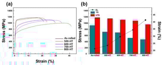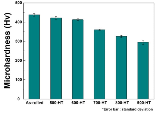 Figure 7 shows the evolution of microhardness with increasing annealing heat- treatment temperature. The results of hardness measurements showed a gradually decreasing trend of the hardness with the annealing temperature. The tensile properties of the Fe-SMAs for the as-rolled and annealing heat-treated conditions are depicted in Figure 8. In the as-rolled condition, the alloy showed a typical stress-strain response of strain-hardened steel, i.e., clear yielding followed by plastic deformation. The yield strength of the as-rolled Fe-SMA was over 900 MPa, which was much higher than the strength of approximately 600 MPa of the same hot-rolled alloy []. This data indicates the strong work-hardening capability of the Fe-SMA containing TiC. Increasing the annealing temperature resulted in decreased yield and tensile strengths while the maximum elongation was increased, as shown in Figure 8b. This behavior can be easily understood by considering the annealing and recrystallization. During the annealing heat-treatment, microstructural defects such as dislocations and shear bands are released, leading to the easier γ to ε phase transformation and γ slip deformation. When the annealing heat-treatment temperature is higher than 800 °C, high density dislocation develops into recrystallization nucleation, as shown in Figure 3. These two mechanisms reduce interactions between dislocations and hence lower the strength of the alloy. Meanwhile, the 500-HT and 600-HT samples maintained comparably high-yield strengths of around 700 MPa, which are still higher by approximately 100 MPa compared to the hot-rolled Fe-SMA []. For these annealing conditions, the texture effect works by increasing the yield strength since the {101} texture component decreases where the strength is the weakest, as reported by Arabi-Hashemi et al. []. As shown in Figure 5, the {101} texture intensity along the RD increased with annealing temperature when the annealing temperature was higher than 700 °C, following the recrystallization. The low yield strengths in the samples annealed at over 700 °C are probably associated with the texture effect as well as with the replacement of severely work hardened structures by undistorted equiaxed grains by the recrystallization.