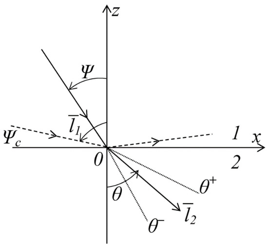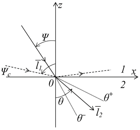 The angle under which the crack from Medium 1 enters the interface with Medium 2 is not known, and it can be assumed that the angle of incidence is random. Accordingly, the angle under which the crack enters Medium 2 is also a random angle, due to the connection between these angles under the Snel van Royen law. Therefore, the process of the crack passing from Layer 1 into Layer 2 will be characterized by the conditional probability density , which satisfies the equation, as follows: