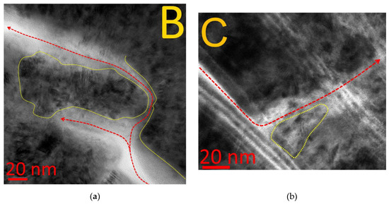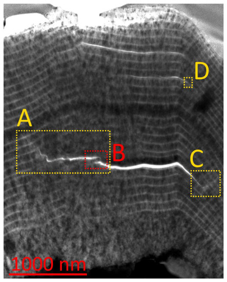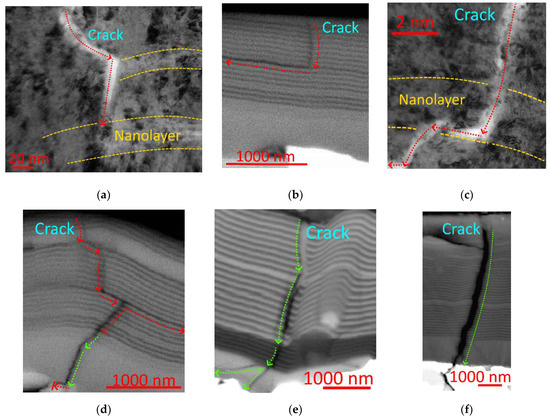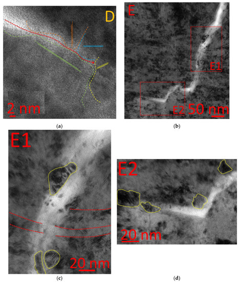 Similar patterns of crack propagation can be noticed in another area of the coating under consideration (Area E, Figure 9b–d). In particular, there is a step-by-step transformation of the crack growth direction under the mechanism of “delamination–transverse crack cutting through a nanolayer–delamination” (Figure 9b). The closer examination reveals the influence of the crystalline structure of the layers on the crack growth direction. With sufficient growth energy, the crack continues to grow along the intercrystalline interfaces and then cuts through the internanolayer interfaces (Area E1, Figure 9c) and, when the growth energy decreases, the crack stops, resting against the crystal at the nanolayer interface (Area E2, Figure 9d).