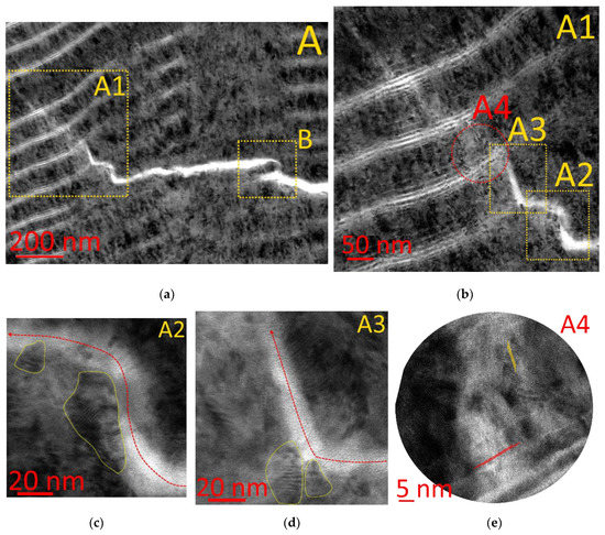 Pattern of crack propagation through the structure of the nanolayer coating. (a) general view of Area A, (b) General view of area A1—crack completion, (c,d) areas A2 and A3—fracture direction transformation, (e) Area A4—change in crystal structure during crack propagation.