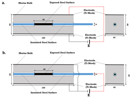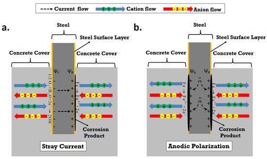 Figure 1a). Stray current leads to the formation of anodic zones (corroding areas) where the current leaves the steel surface. In other words, only part of the steel surface can be corroded by the stray current, while in conditions of anodic polarization, the whole steel surface acts as an anode.