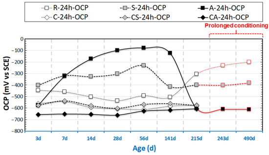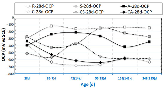p records and compared to the 28d-cured reference case (R-28d), more cathodic OCP values of ca. −290 mV are observed for group S-28d at the time interval of 243 days.