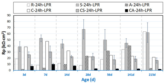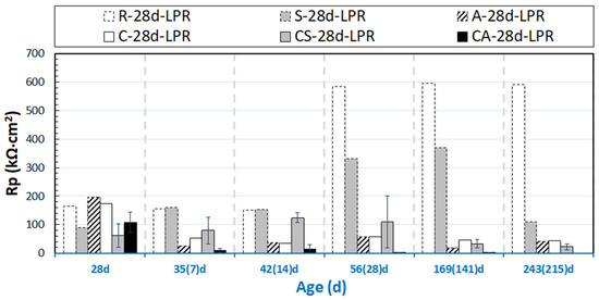 2, at 243 days), i.e., lower corrosion resistance, if compared to the 28d-cured reference specimen R-28d (590 kΩ∙cm