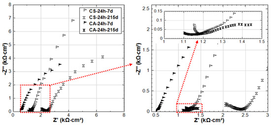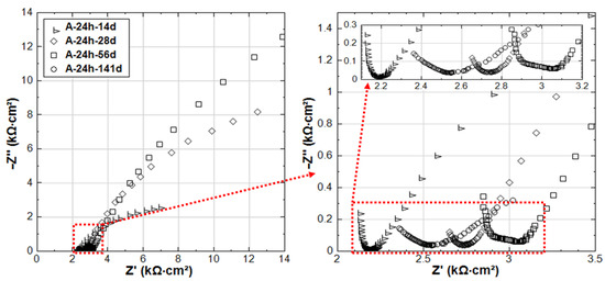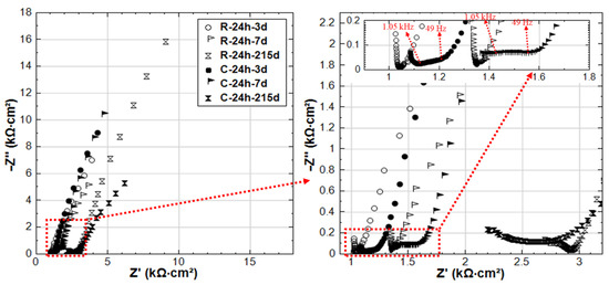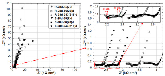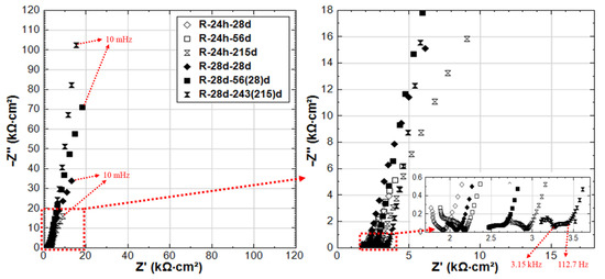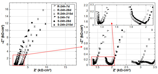 Figure 8) increase with the time of conditioning for both R-24h and S-24h, indicating the increase of bulk matrix resistance due to the ongoing cement hydration. For specimen S-24h, the magnitude of HF Z’ is slightly higher than that for R-24h at the initial time intervals of 7–28 days. In the meanwhile, the LF responses of S-24h (at 7 and 28 days) reflect a more corrosion resistant steel surface compared to R-24h. Both LF and HF responses before 28 days for specimens R-24h and S-24h are in line with the OCP and R