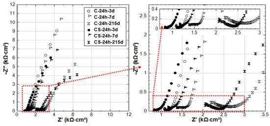 27]. The response means EIS curves inclined to the y-axis, specifically in the LF EIS response range, denoting a capacitive-like behavior (passive state of the steel). This is relevant for both R-24h and R-28d at the end of conditioning, denoting the stabilization of the passive layer over time.