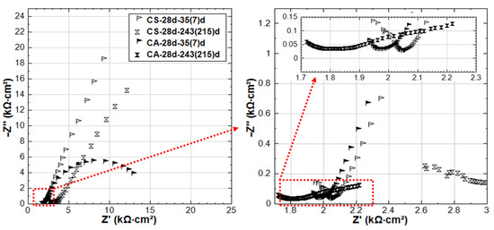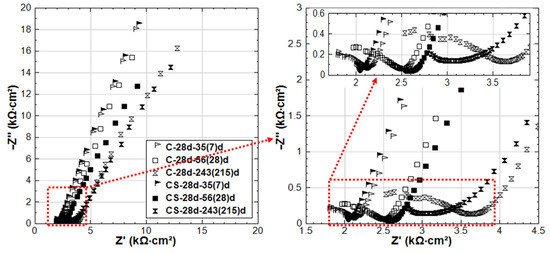 Figure 7, inlet). As can be observed, the magnitude of real |Z| increases over time (due to cement hydration in both cases), but it ends up higher for the 28d group at 215d of conditioning. For the last time intervals (after 215d conditioning), an additional time constant (in the range of 3.15 kHz–112.7 Hz,