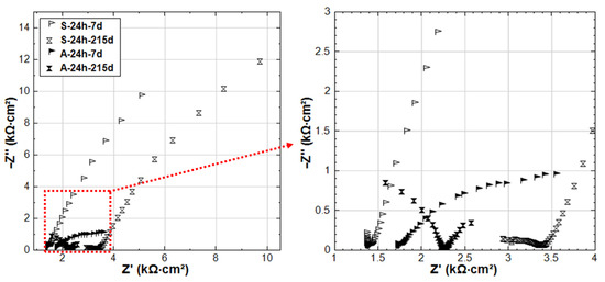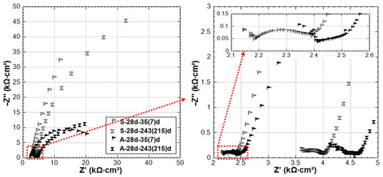 Figure 16) is already recorded at 35 days of age (after 7 days conditioning). The EIS response in the LF domain inclines to the x-axis, indicating an active steel surface. This response again confirms that anodic polarization induces corrosion for reinforcing steel. Comparing the EIS response of S-28d and A-28d (standard curing for 28 days), a more significant corrosion behavior is recorded for A-28d. This is supported by the OCP and R