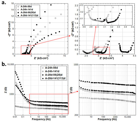 Figure 15, the real component of impedance Z’ in the HF range, reflecting the resistance of the bulk matrix, is lower for A-24h compared to that of A-28d at both 56 and 141 days.