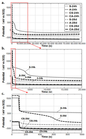 Figure 19c). At the moment of switching off the current supply, the potential drop reflects the contribution of the so-called “IR drop”. After a certain decay and toward the 24h time interval, the potentials of all specimens are stable (see