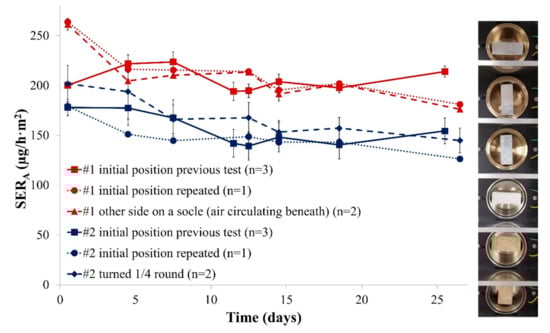 It has been demonstrated in previous work that the flow circulation in the microchamber is heterogeneous [32]. The height of the sample could disturb the air flow and thus would have an influence on the emission. This is of particular importance in the case of specimens that represent one-third of the chamber volume. For this reason, formaldehyde emission was analysed for different positions of both Samples #1 and #2 in the microchamber. The results are provided in Figure 2.