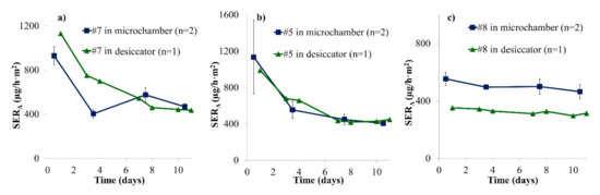 Emission profiles of formaldehyde from puzzle pieces in two different emission chambers over 10 days (SERA, area-specific emission rate). (a) Sample #7; (b) Sample #5; (c) Sample #8. Error bars represent SD.