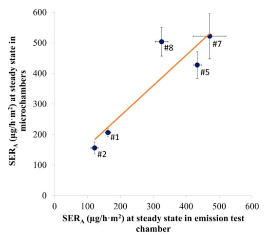 The linear correlation between the emission rates measured at steady state in the emission test chambers and the microchambers is shown in Figure 4. For Samples #1, #2 and #8, the whole measurement period was considered as steady state. For Samples #5 and #7, only the measurements at Days 7 and 10 were considered.