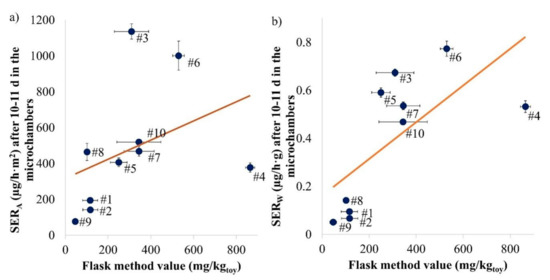 Study of the linear correlation between the flask method values and the area-specific ((a) R2: 0.145; p-value: 0.27775) or weight-specific ((b) R2: 0.470; p-value: 0.02876) emission rates after 10 or 11 days in the microchamber for each sample investigated. Error bars represent SD (n = 2 for microchamber samples, for flask method see Table S2).